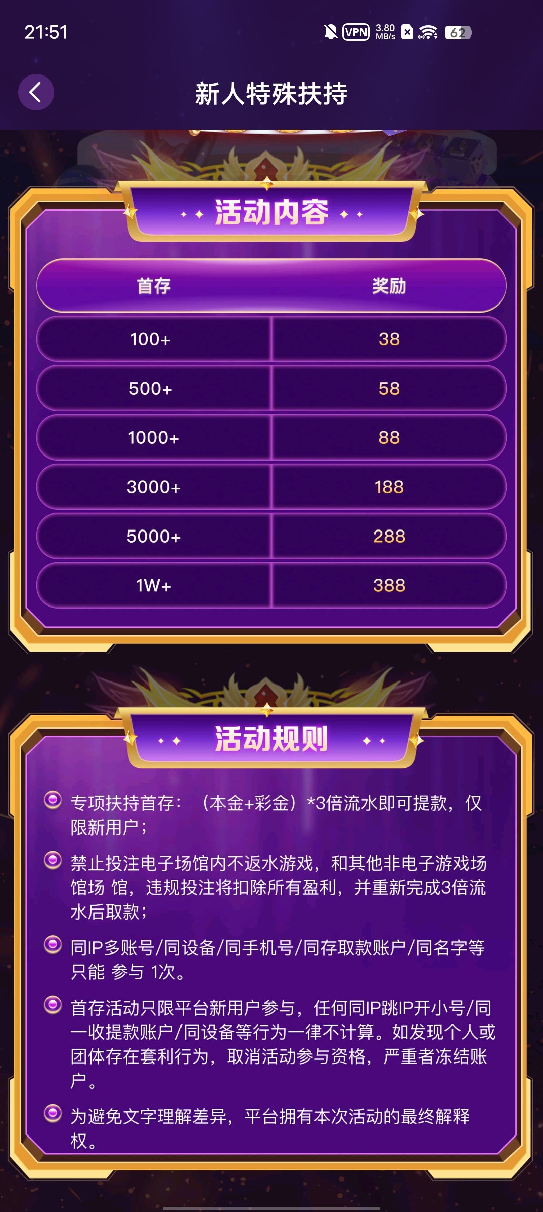 ✅完成累计3天存款/累计存款1000以上/3000流水。3个要求缺一不可! 达标要求不过审,保底返现88-188